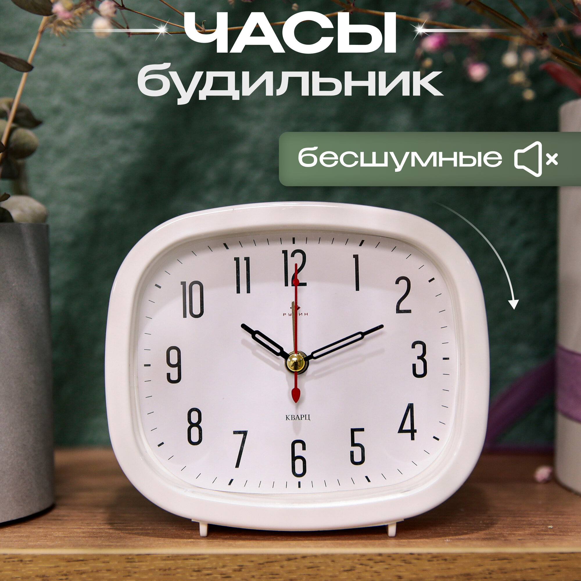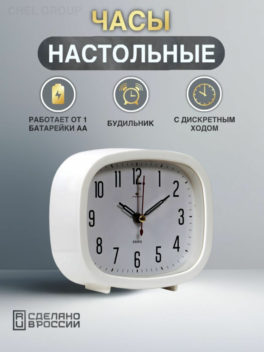 Будильник настольный Рубин классический белый, 12.5 х 10.5 см для дома, в спальню