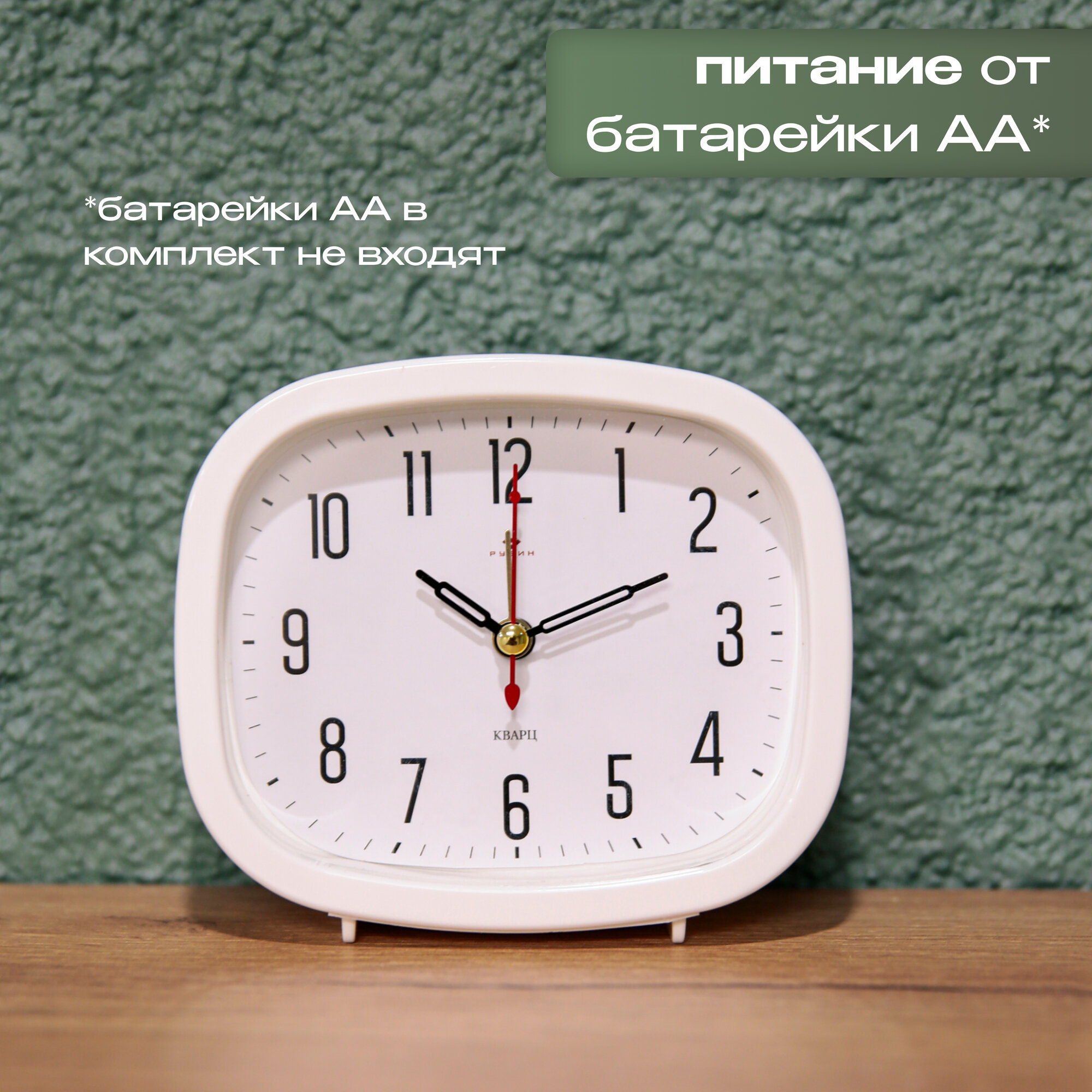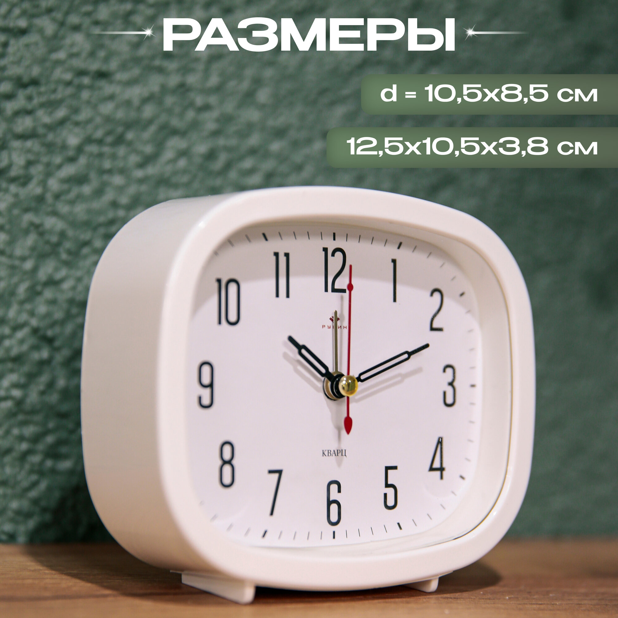 Будильник настольный Рубин Классика для спальни с арабскими цифрами, от пальчиковой батарейки АА, ширина 12.5 см высота 10.5 см