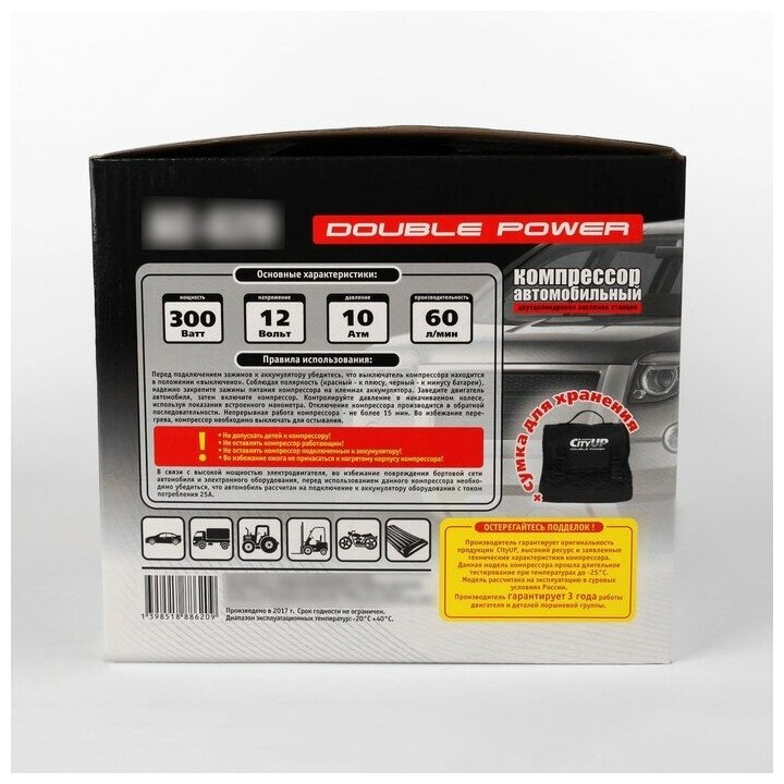 Автомобильный компрессор CityUP AC-620 Double POWER 60 л/мин. До 10 Атм. 300 Вт. Сумка в комплекте. Питание от аккумулятора.