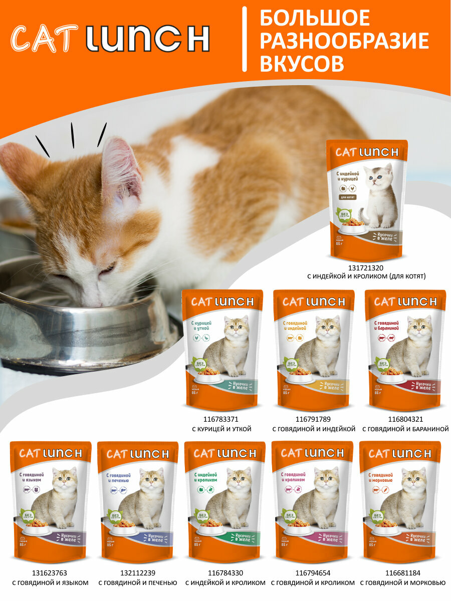 Влажный корм для кошек Cat Lunch кусочки в желе Говядина и Кролик, паучи по 85г (24 шт. в упаковке)