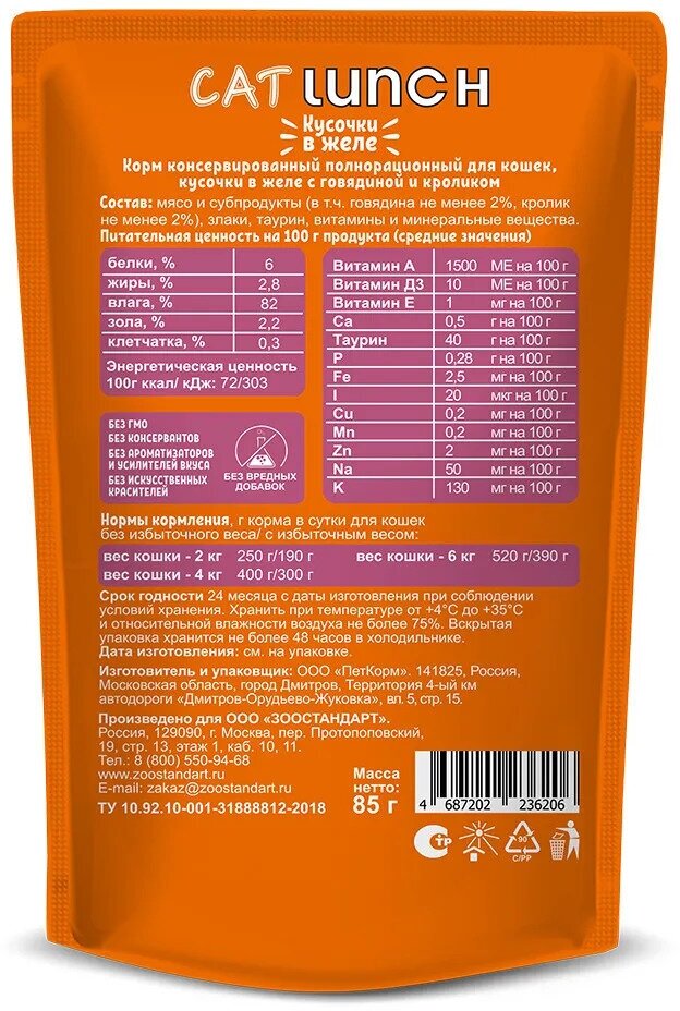 | Состав | мясо и субпродукты (в том числе говядина не менее 2%, кролик не менее 2%), злаки, таурин, витамины и минеральные вещества. |