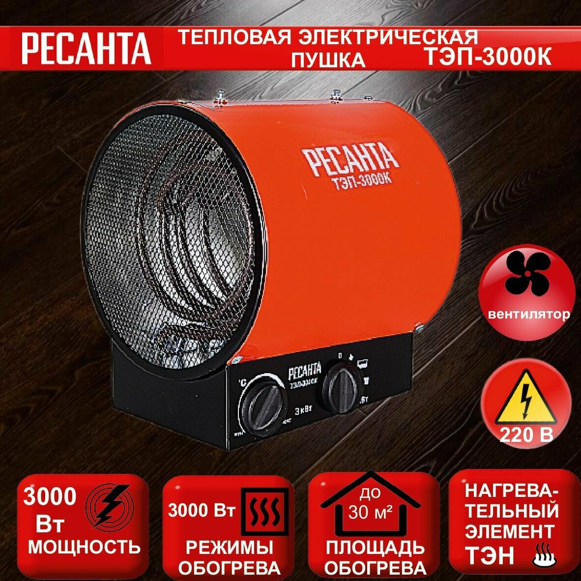 Тепловая пушка электрическая РЕСАНТА ТЭП-3000К, 3000 Вт, 220 В, круглая, красная интересное: