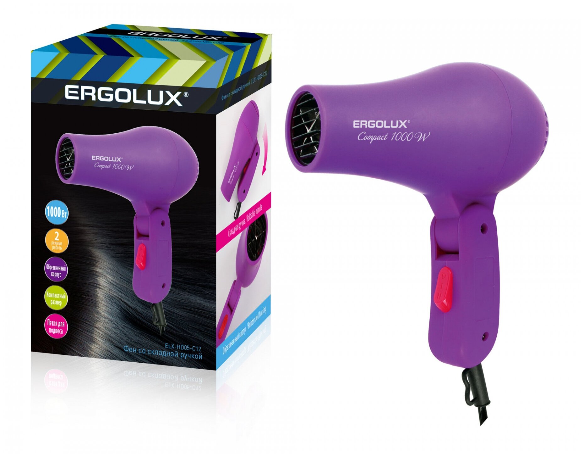 Фен ERGOLUX, ELX-HD05-C12, 1000Вт/220V, пластик, складной, 2 режима скорости, цвет: фиолетовый