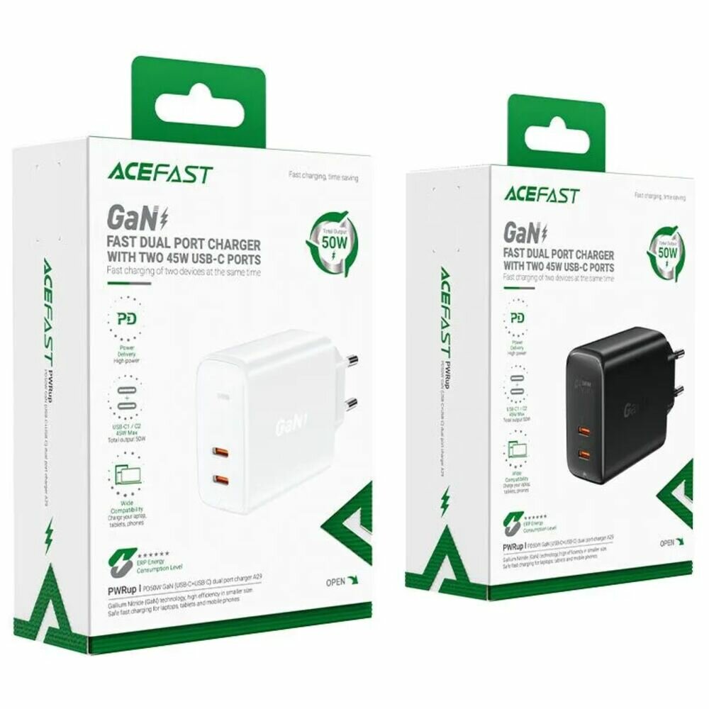 Зарядное устройство ACEFAST A29 PD50W GaN USB-C+USB-C dual port charger (EU). Цвет: черный.