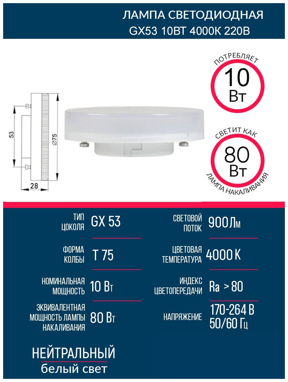 Светодиодная лампа Grisard Electric T75 таблетка GX53 10Вт 4000К 220В GRE-002-0077(1) интересное: