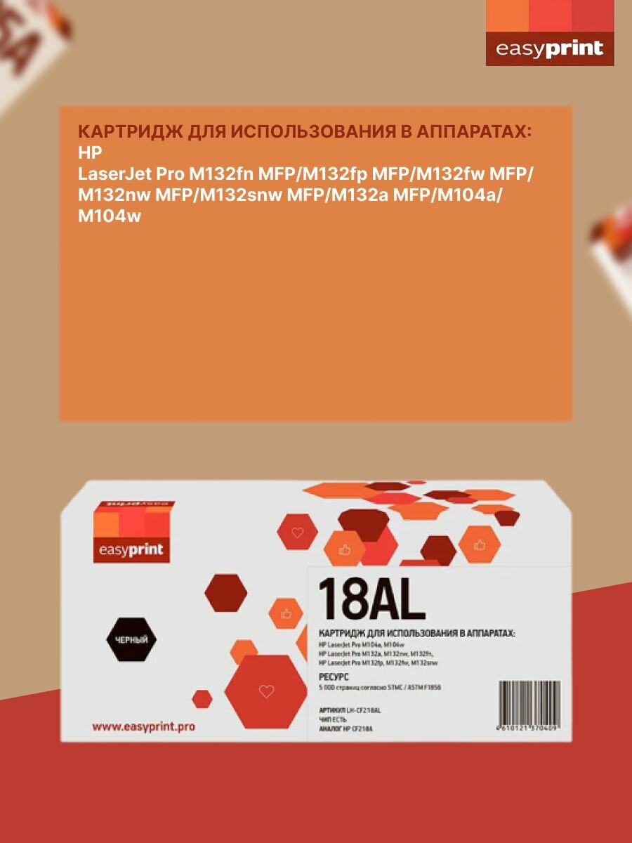 18AL Картридж EasyPrint LH-CF218AL для HP LJ Pro M104a/M104w/M132a/M132fn/M132fw/M132nw (5000 стр.) с чипом интересное: