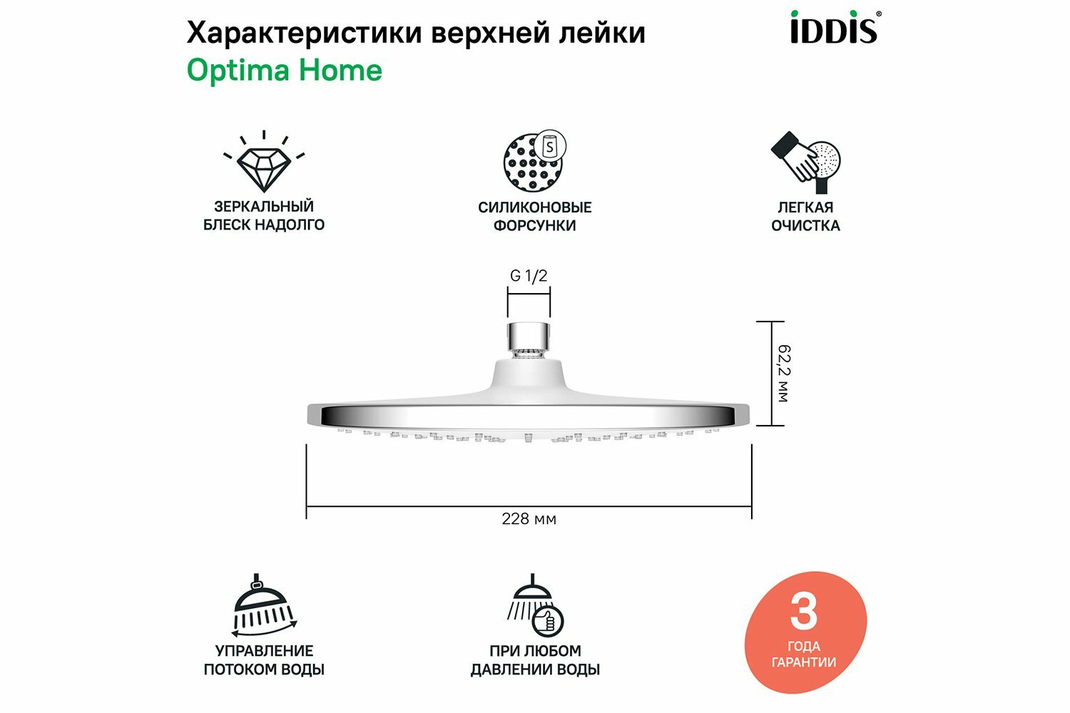 Верхний душ IDDIS Optima Home d228 мм, 1 режим, хром OPH22CRi64
