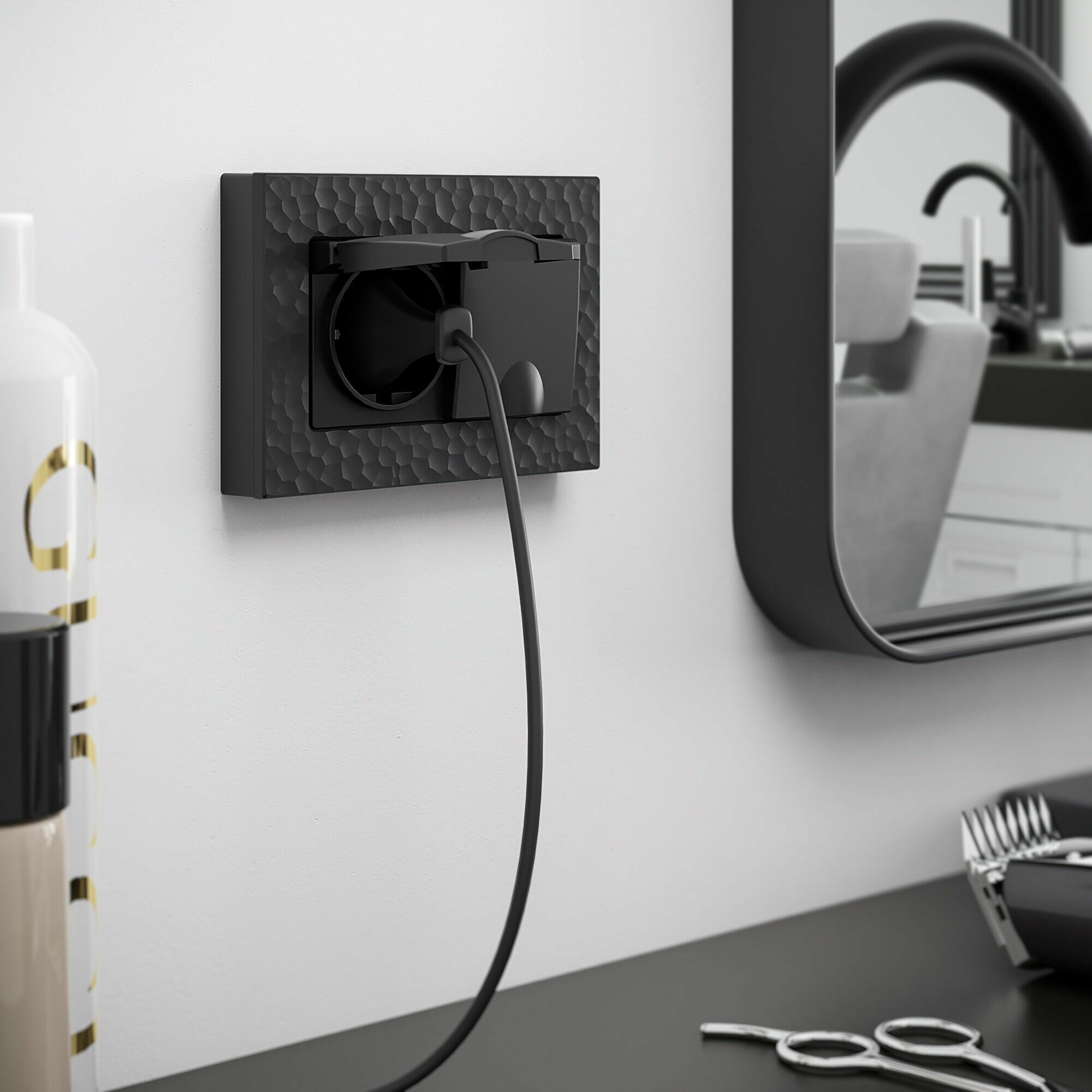 Розетка двойная Werkel Hammer влагозащищенная с заземлением с защитой крышкой и шторками (черный матовый)