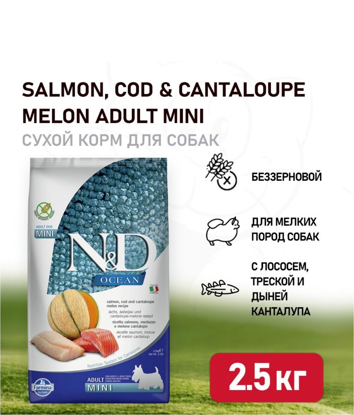 Сухой корм Farmina N&D Ocean для взрослых, пожилых собак маленьких мелких мини пород, Фармина НД беззерновой рацион со вкусом лосося, трески и мускусной дыни, 2,5кг