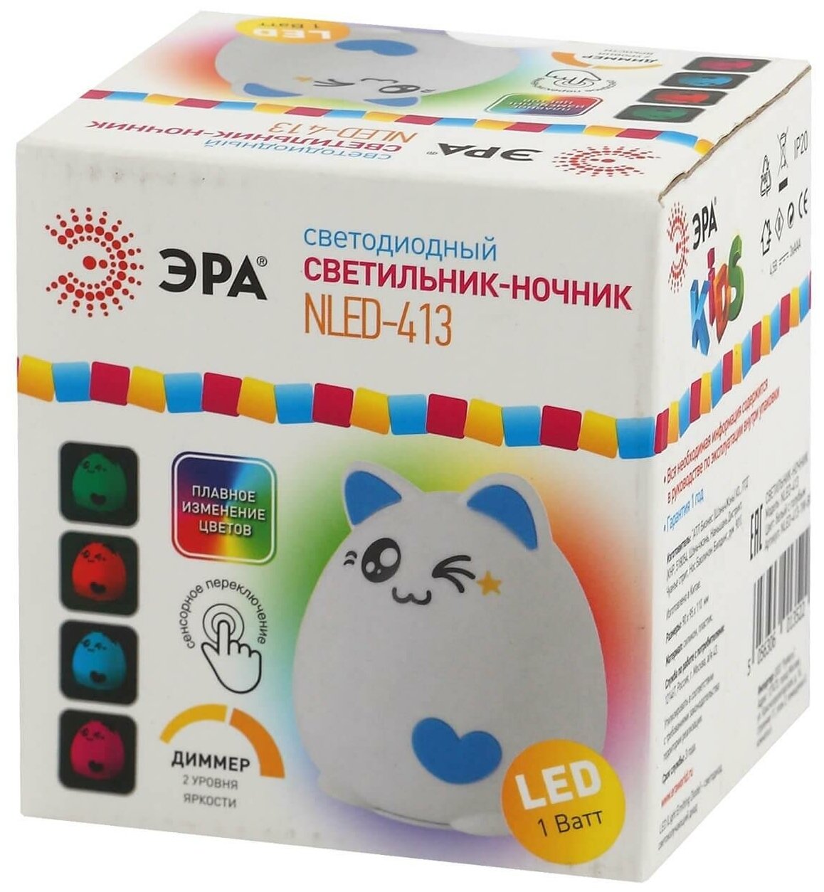 ЭРА ночник св/д детский мягкий 1W NLED-413-1W-BU белый с синим котик, сенсор, RGB (3хААА) 3522
