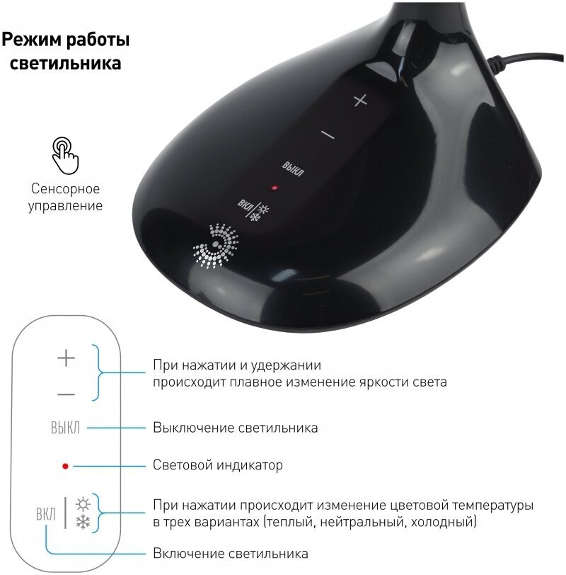 | Дополнительная информация | Функциональные преимущества: Светильник со светодиодами (LED) в качестве источников света. Выбор цветовой температуры - 3 цвета: 3000К, 4500К, 6000К. Сенсорное переключение. Пятиступенчатый диммер для регулировки яркости. Гибкая стойка - наклон и поворот плафона в любом направлении. |