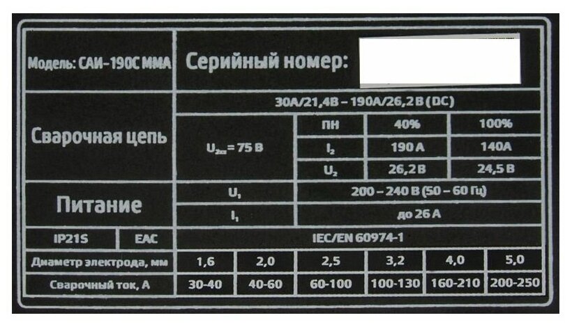 | Сварочный ток (MMA), max | 190 А |