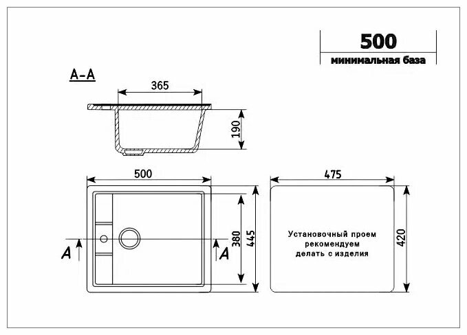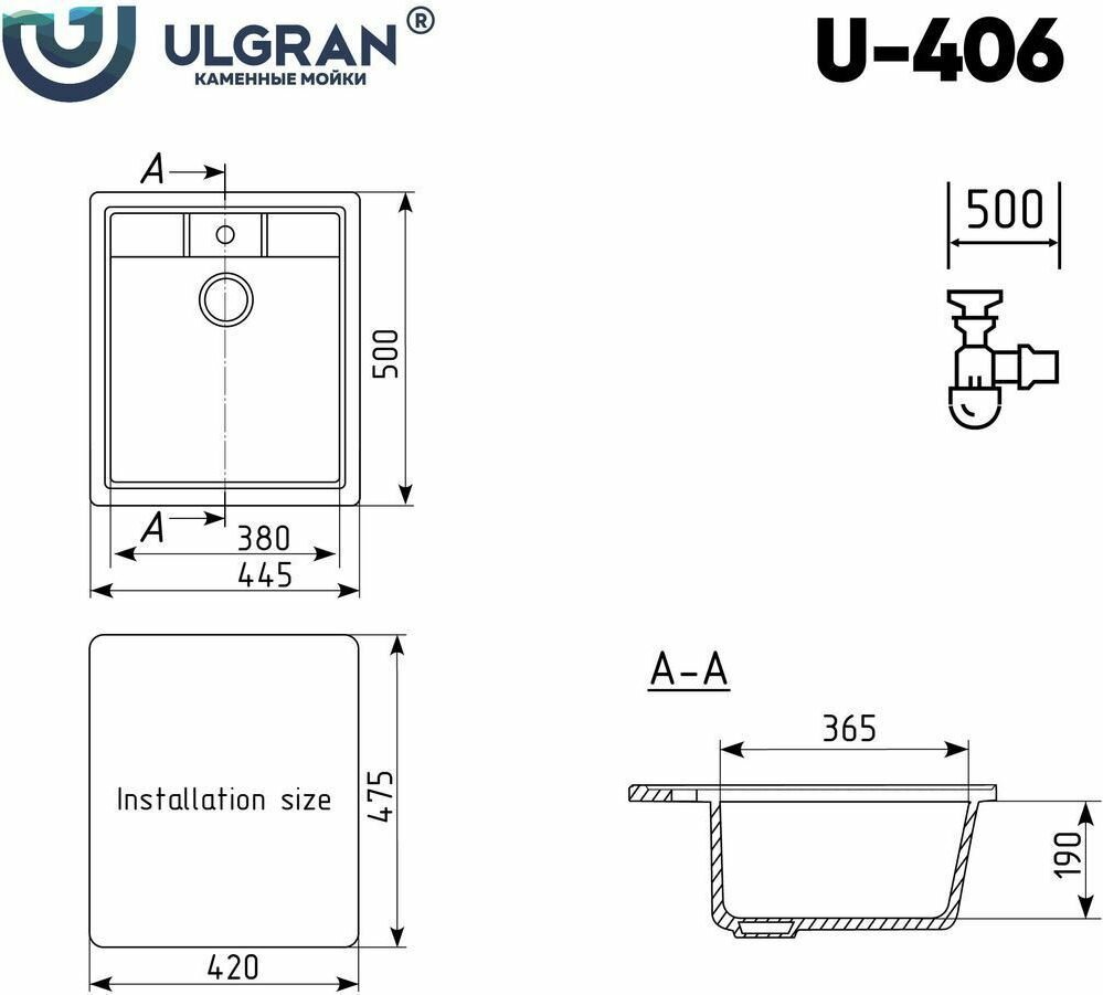 Мойка Ulgran, мрамор, U-406-344, (445*500*190 мм), ультра-черный, сифон и сливная арматура