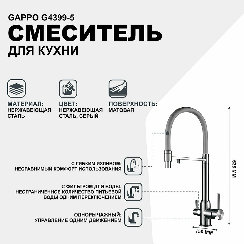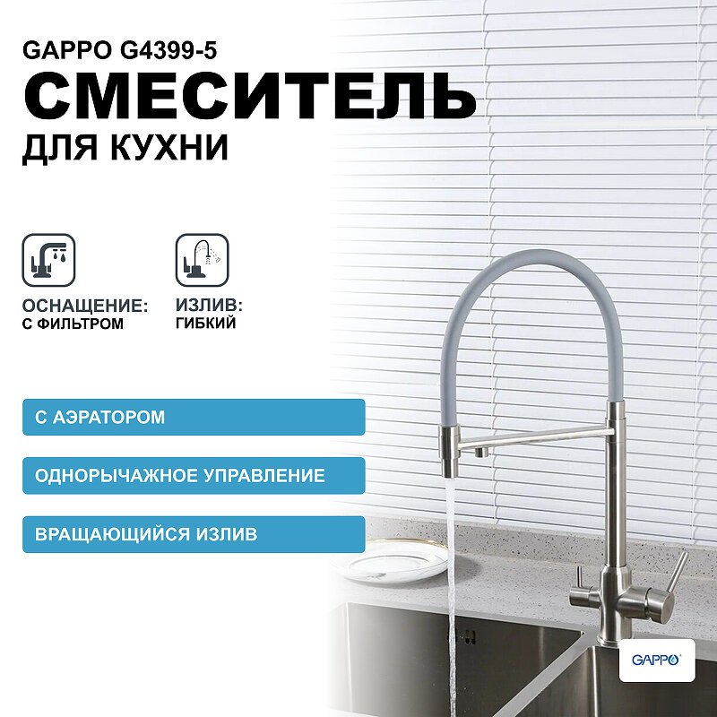 Смеситель для кухни Gappo G4399-5 c встроенным фильтром, сатин