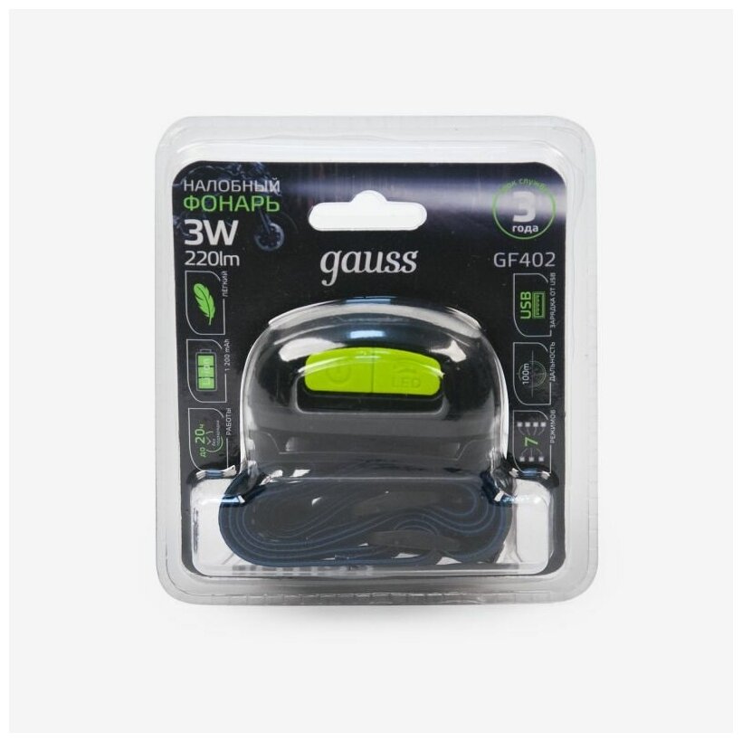 Фонарь налобный Gauss модель GFL402 3W 220lm Li-ion 1200mAh LED 1/10/100