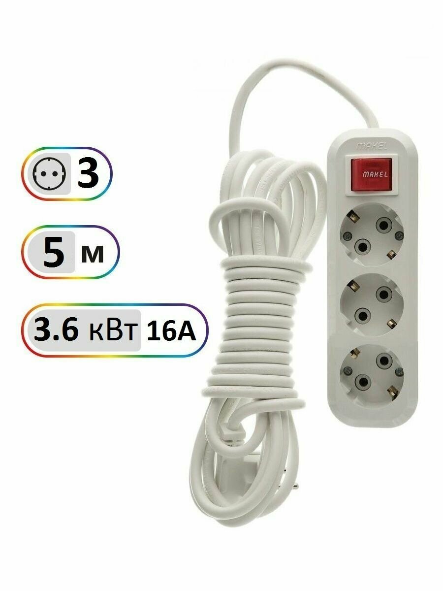 Удлинитель бытовой Makel (MGP214) с заземлением 5 м 16 А 250 В 2,2 кВт 3 розетки ПВС 3х1 мм2 IP20 с выключателем белый