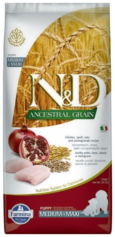 Корм Farmina N&D ANCESTRAL GRAIN Chicken & Pomegranate Puppy Medium/Maxi для щенков средних и крупных пород с низким содержанием зерна, курица с гранатом, 12 кг