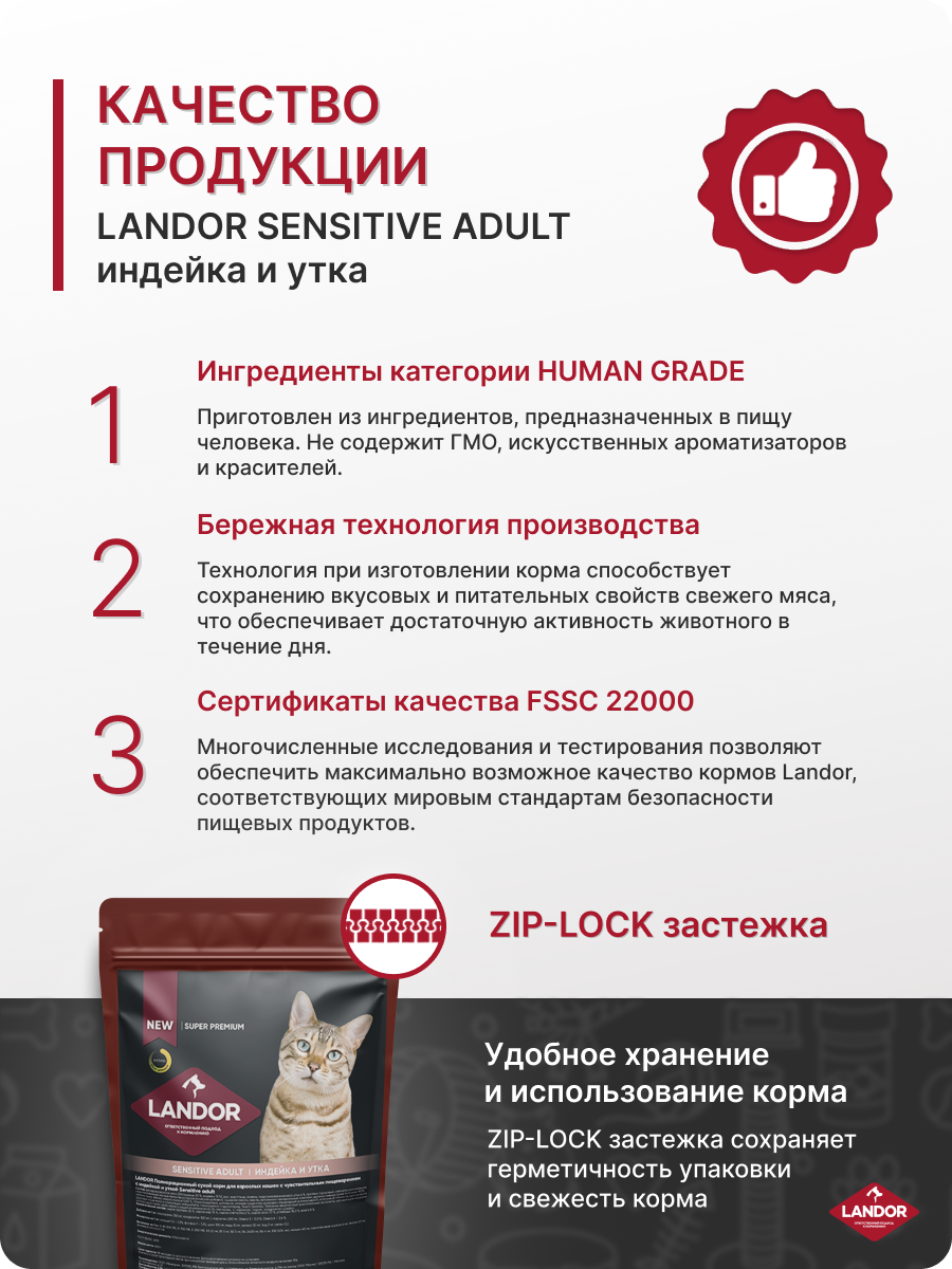 Купить LANDOR полнорационный сухой корм для взрослых кошек с чувствительным пищеварением c индейкой и уткой, 400г