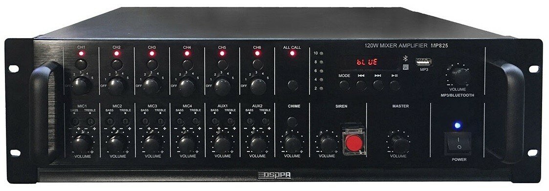 DSPPA MP-825 Комбинированный микшер-усилитель, 6 зон c регулировкой уровня выходного сигнала отдельной зоны, 250 Вт/100В, 4 микр, 2 лин входа, 1 Aux вых. MP3 плеер, вход USB для FLACH памяти. Питание 220В. Габаритные размеры 483х132х413. Масса 17 кг