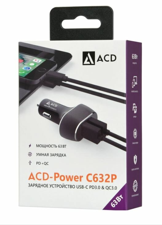 Купить Автомобильное ЗУ (acd-с632p-v1b) 63Вт, 2xUSB 1PD+1QC, 3.620В/3А RTL Acd-с632p-v1b