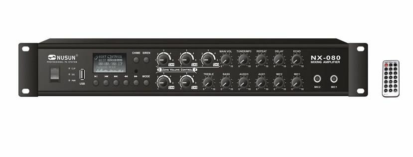 Nusun NX-080 микшер-усилитель 2микр+3лин, FM-тюнер, USB,80W,70/100V,4-16 Ом, 100-16kHz, 5 рег. зон
