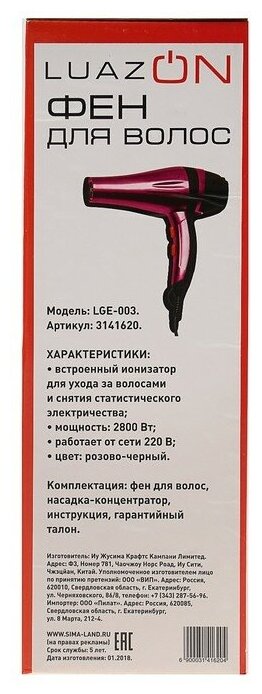 Ниже Вы можете прочитать отзывы на Luazon Home Фен Luazon LGE-003, 2800 Вт, 2 скорости, 3 температурных режима, розово-черный, ознакомится с подробными характеристиками, посмотреть интересные обзоры и фотографии на Luazon Home Фен Luazon LGE-003, 2800 Вт, 2 скорости, 3 температурных режима, розово-черный.