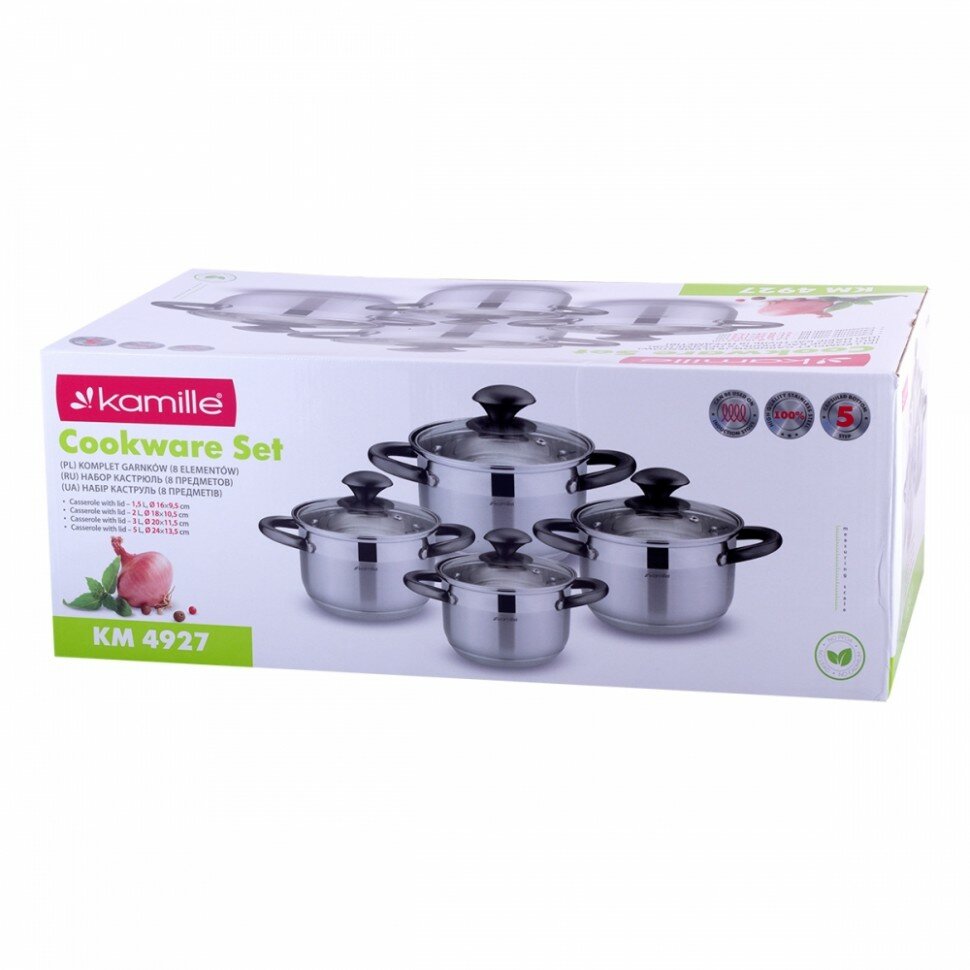 Набор кастрюль 8 предметов (1,5л, 2л, 3л, 5л; полые черные ручки) из нержавеющей стали Kamille 4927