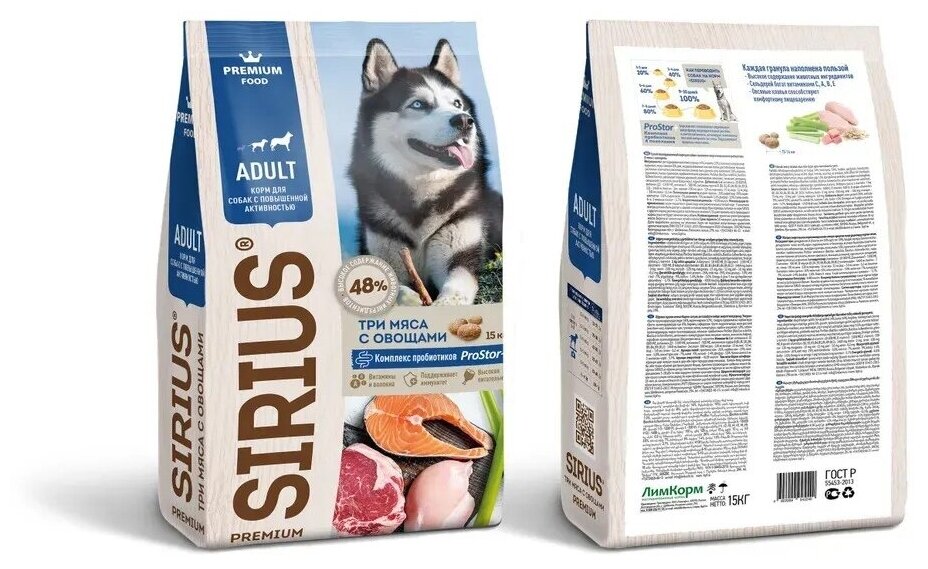 Ниже Вы можете прочитать отзывы на Сухой корм для собак SIRIUS, с повышенной активностью, три мяса с овощами, 15 кг, ознакомится с подробными характеристиками, посмотреть интересные обзоры и фотографии на Сухой корм для собак SIRIUS, с повышенной активностью, три мяса с овощами, 15 кг.