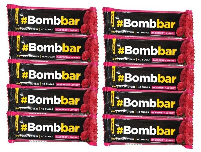 Bombbar Протеиновый батончик в шоколаде без сахара, набор 10x40г (малиновый сорбет) / Бомбар protein bar состав польза для похудения