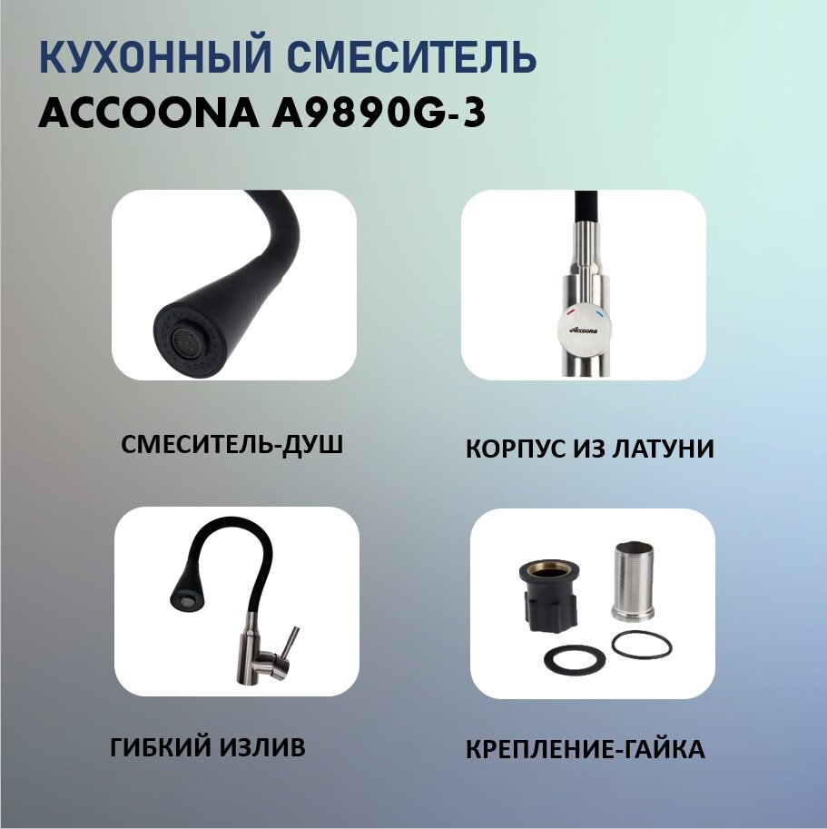 Смеситель для кухни Accoona A9890T-3, однорычажный, гибкий излив, 2 режима, серый