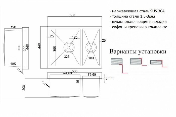 | Дополнительная информация | Мойка, сливная арматура с двумя корзинчатым вентилями 3 1/2, сифон с отводом, комплект креплений |