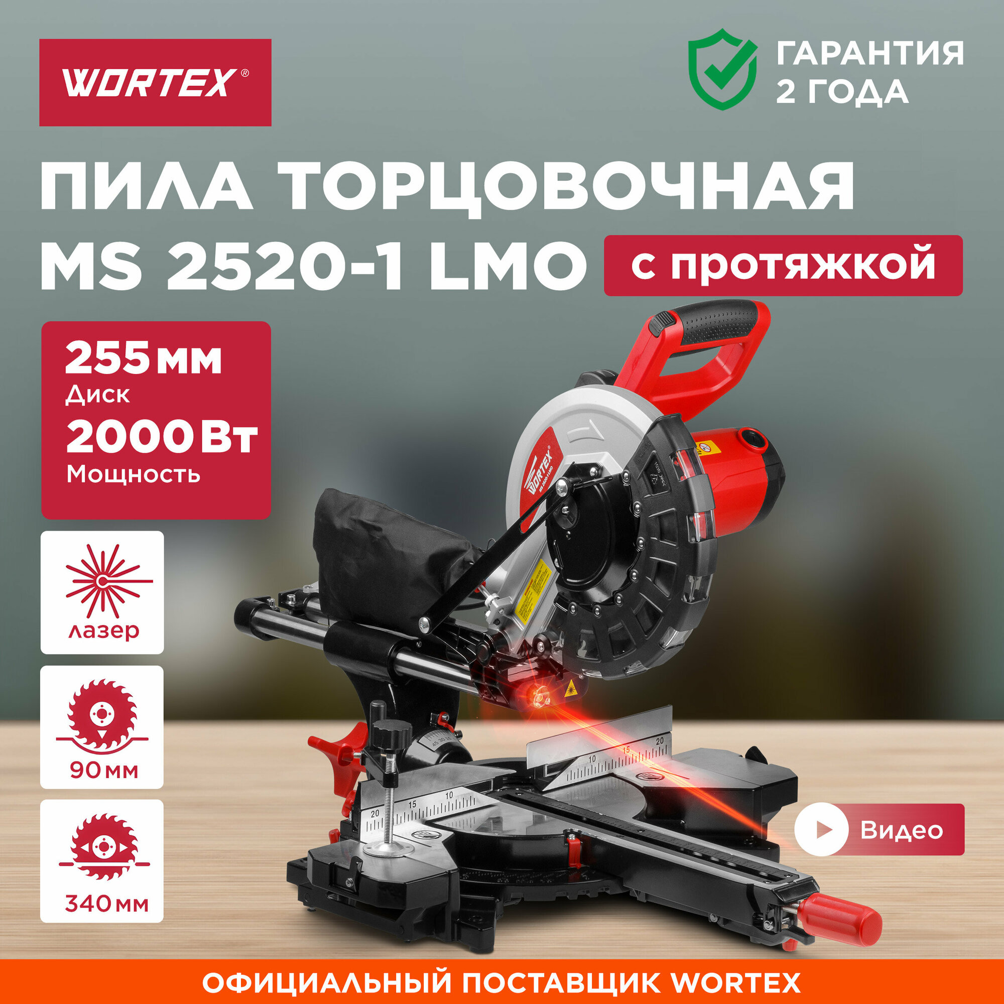 Торцовочная пила с протяжкой WORTEX MS 2520-1 LMO в кор. 2000 Вт, 255х30.0 мм, глуб. до 90 мм, шир. до 340 мм, лазер