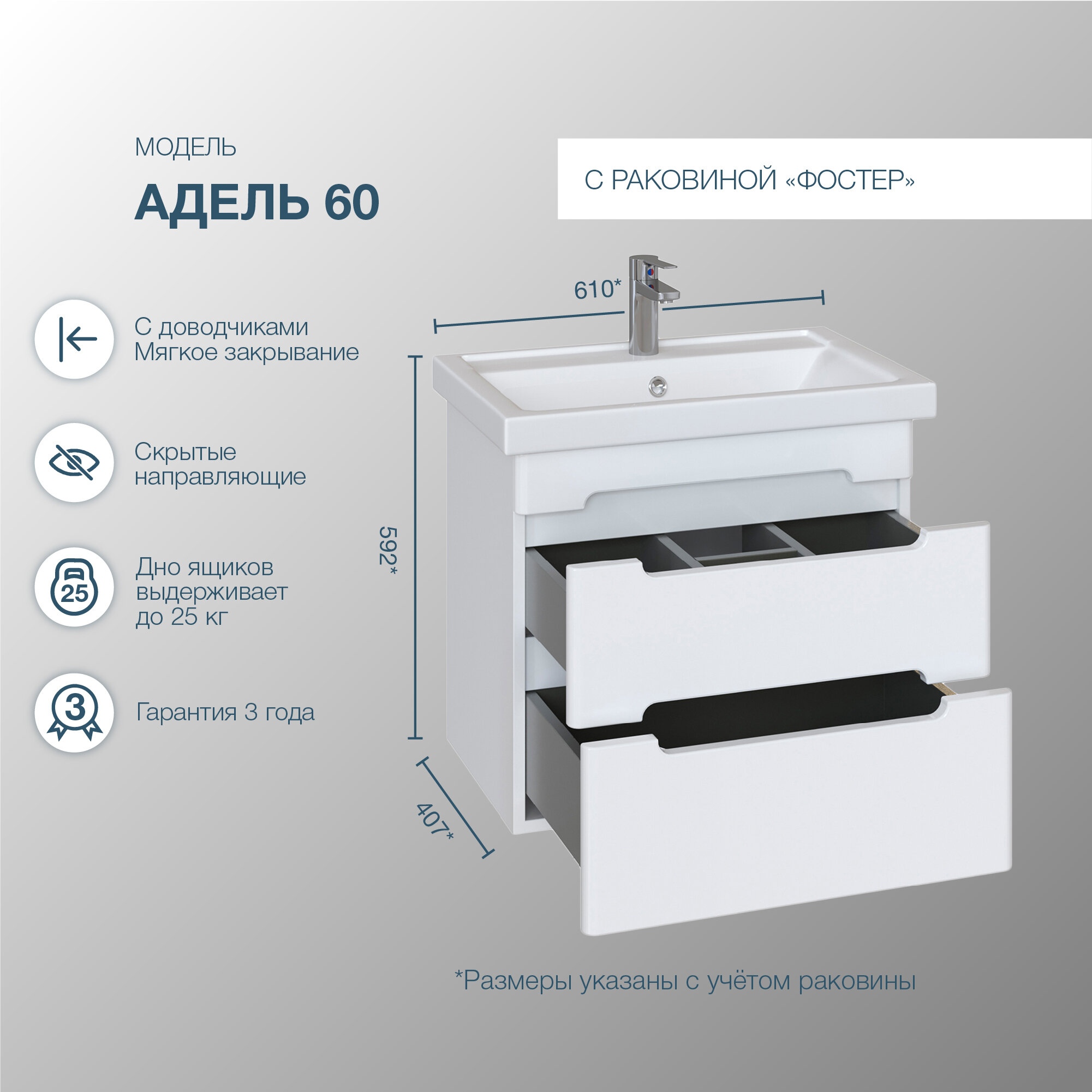 СохранитьSanstar Комплект Тумба Адель 60 подвесная, 2/ящ, мебельный умывальник Фостер 60 171.1-1.4.1.К интересное:
