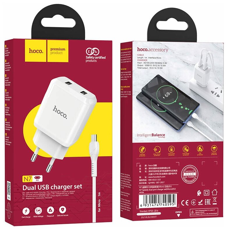 Зарядное устройство HOCO N7 Speedy 2*USB + Кабель USB-Micro, 2.1A, белый