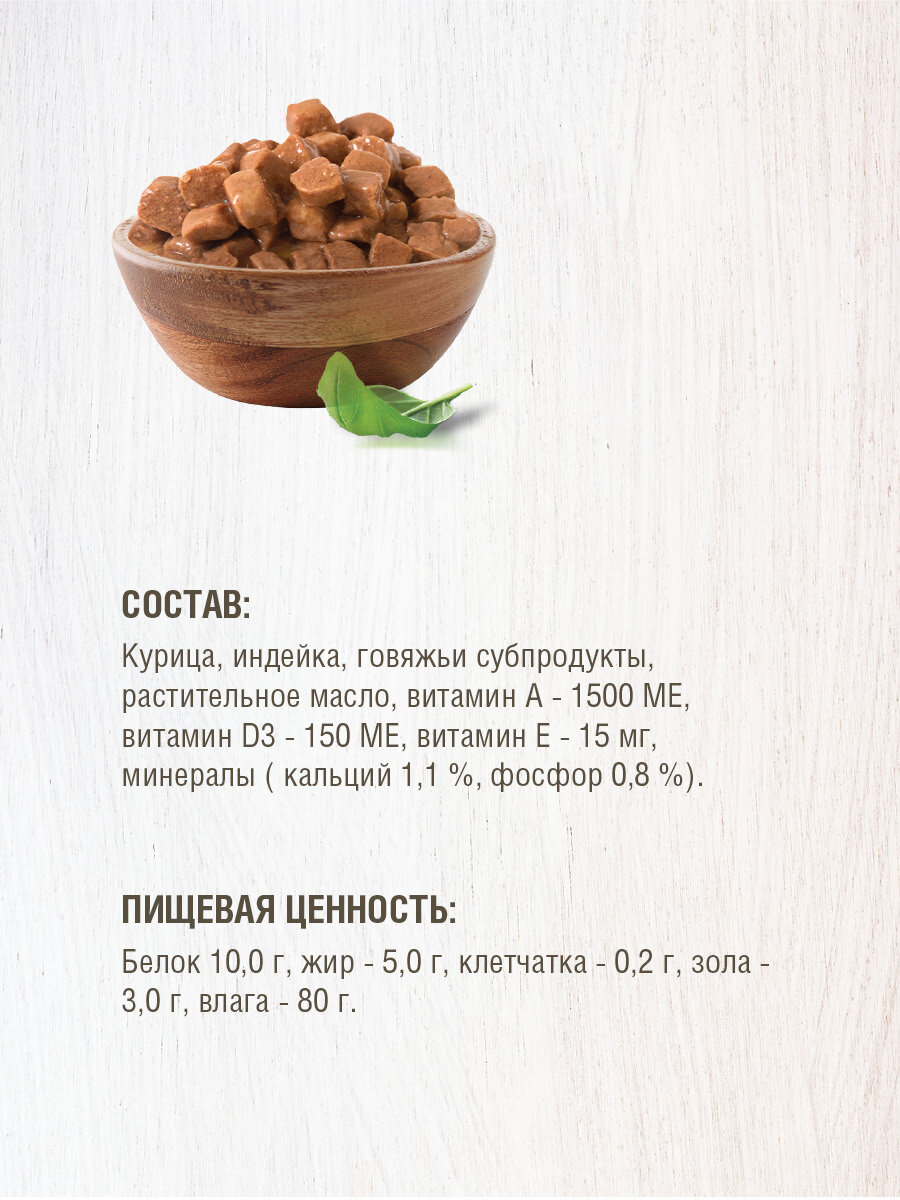 | Состав | курица, индейка, говяжьи субпродукты, растительное масло, витамины |