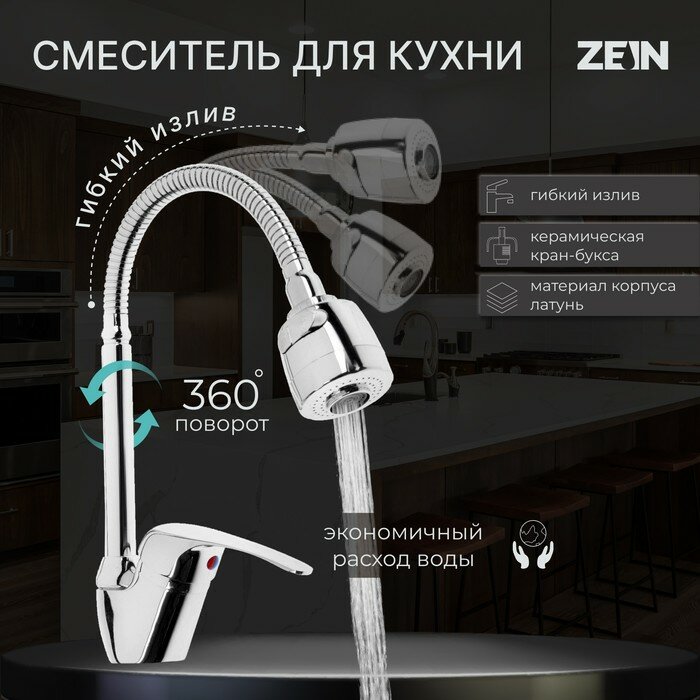 Купить Смеситель для кухни ZEIN Z66350352, гибкий излив, картридж 40 мм, двухрежимный аэратор, хром