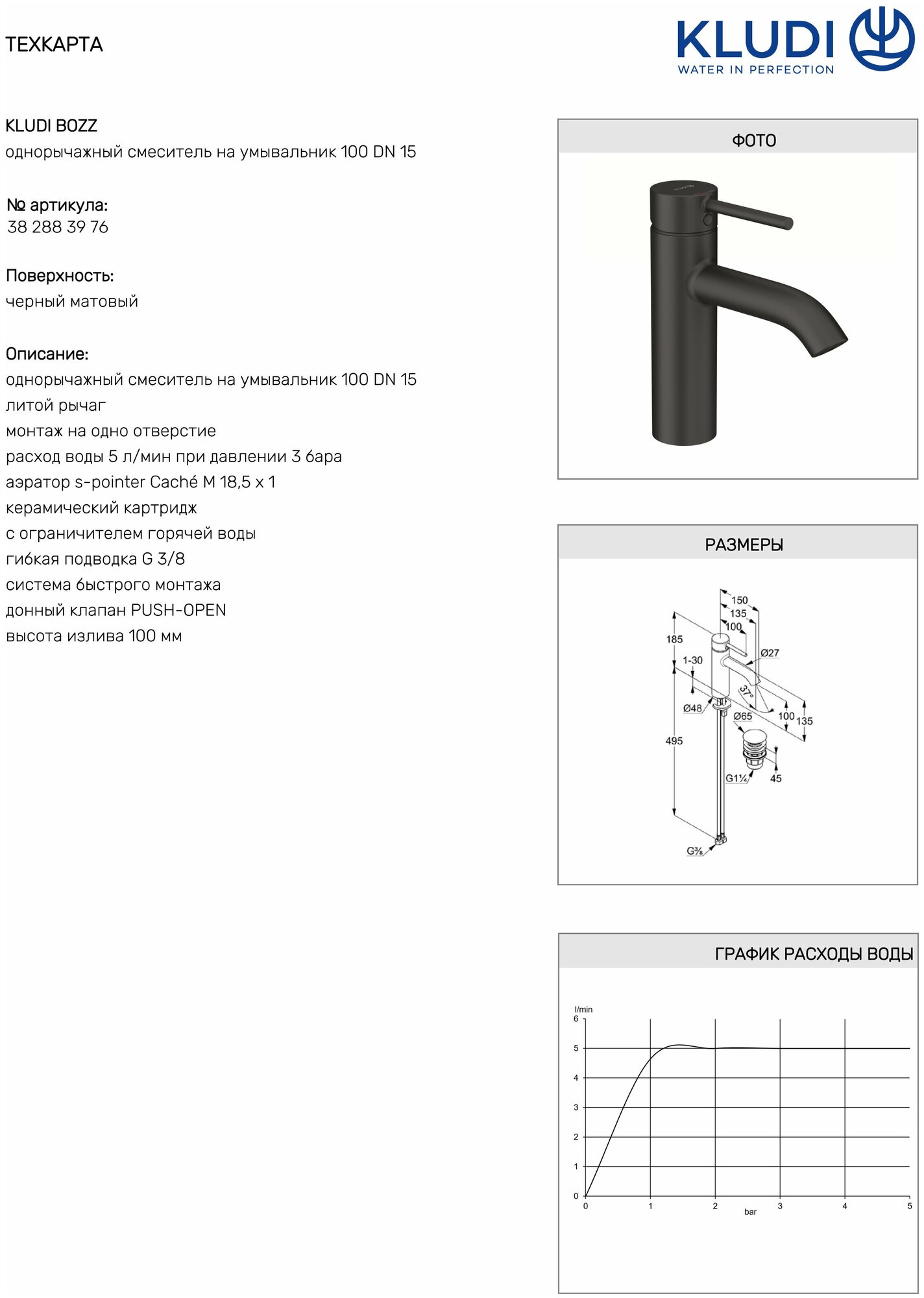 Смеситель для раковины KLUDI BOZZ Керамический картридж Черный матовый (382823976)