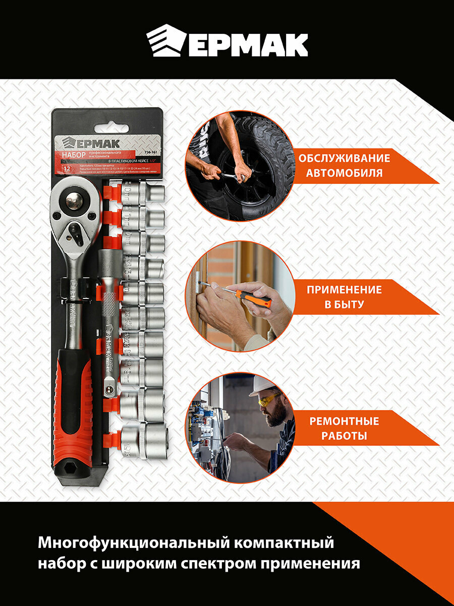 Набор профессионального инструмента ермак 12 предметов, 1/2, головки, удлинитель и трещотка 736-161