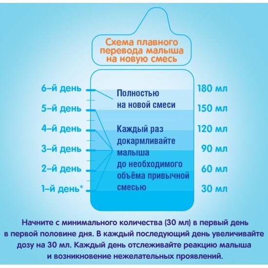 | Отзыв: | Это наша первая смесь. До этого были на ГВ. Продукт понравился малышу , первую порцию выпил очень быстро. Развожу молочко согласно инструкции: 5 мерных ложек на 150 мл. Со стулом проблем не возникло. Аллергия не проявилась.