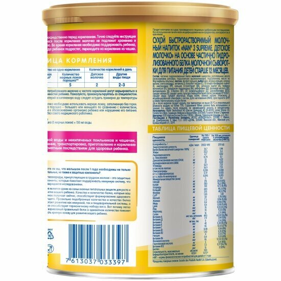 Состав продукта просто бомба. Для меня наиболее важно: гипоаллергенная формула, пробиотики для пищеварения, жирные кислоты для развития мозга, комплекс витаминов и минеральных веществ, отсутствие пальмового масла. Молочко NAN 3 Supreme предлагает более современное и эффективное решение благодаря новому классу олигосахаридов в составе . Малышу понравился вкус молочка NAN® 3 SUPREME. Я доверяю многолетнему опыту компании Nestlé и покупаю у них другую продукцию. Удобная упаковка, хорошо растворяется молочко, не остаются комочки. Я советую молочко NAN® 3 SUPREME другим мамам. |