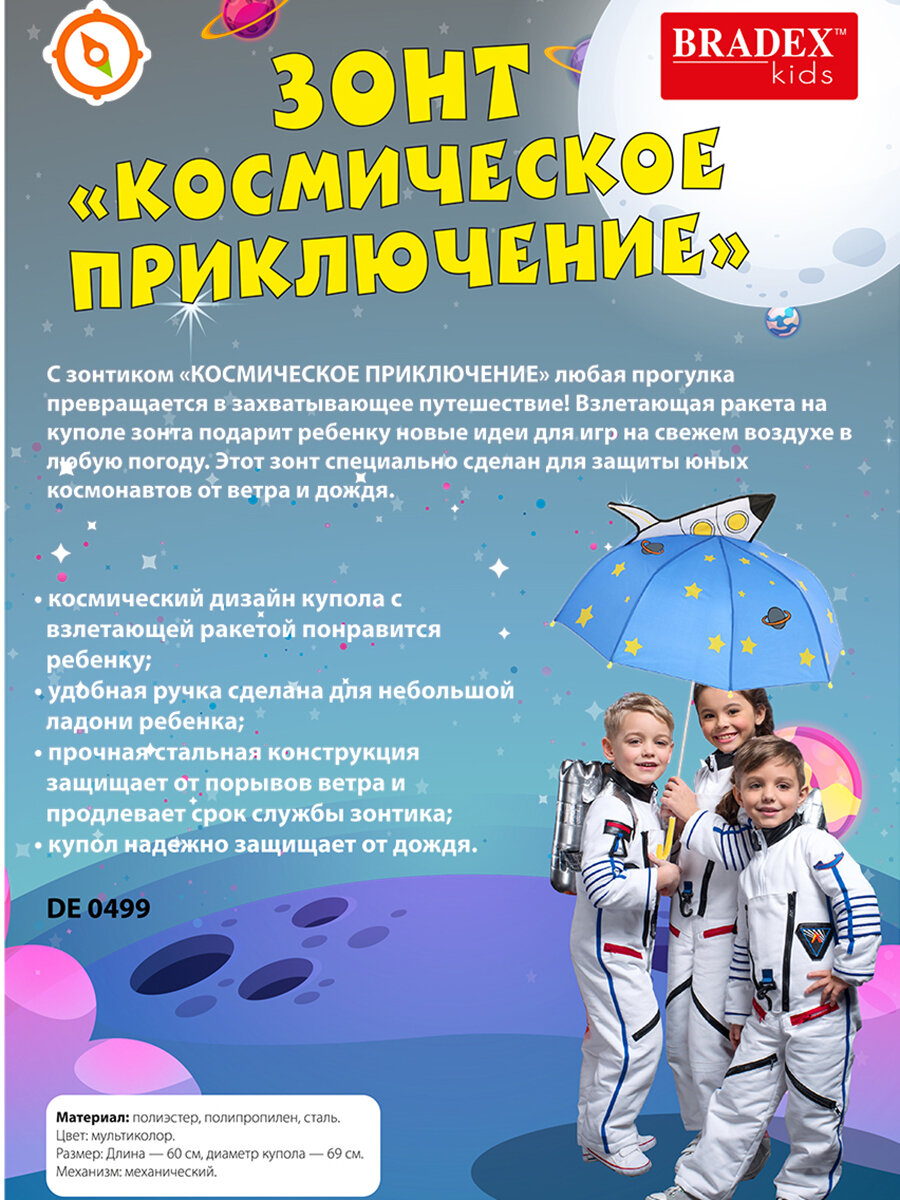 Зонт детский "Космическое приключение" BRADEX, для мальчика, девочки, трость, механический, синий