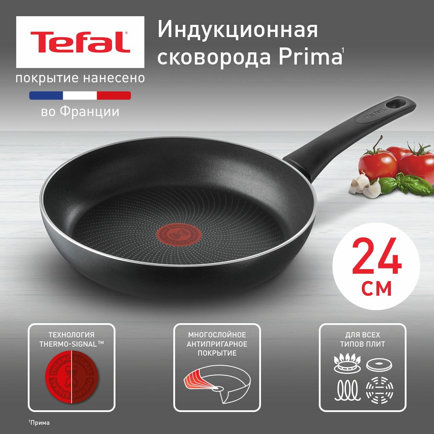 Индукционная сковорода Tefal Prima 04226124 24 см, глубокая, с индикатором температуры, с антипригарным покрытием, для всех типов плит