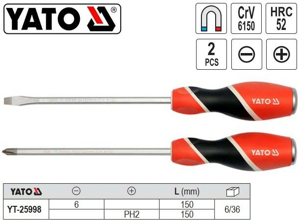 Набор ударных отверток YATO 6х150 мм, 2 шт, CrV6150, HRC52, магнитные, YT-25998