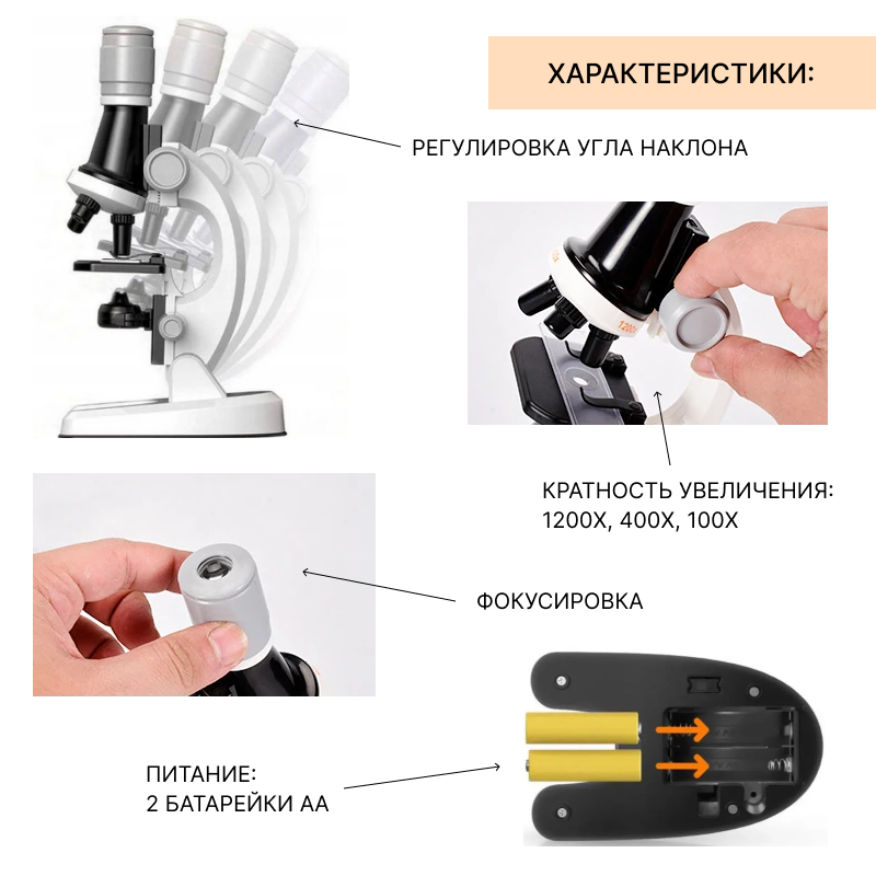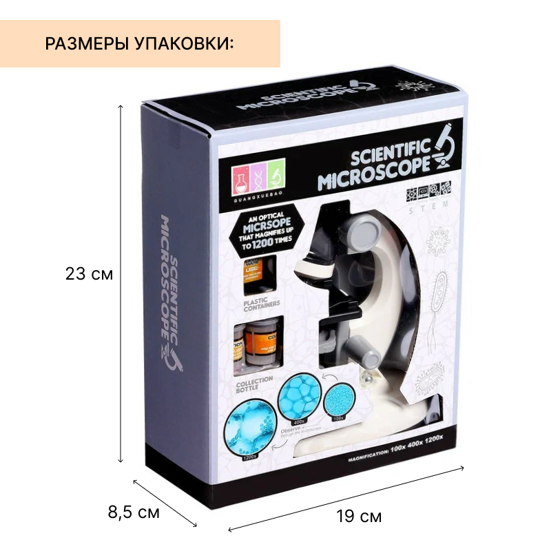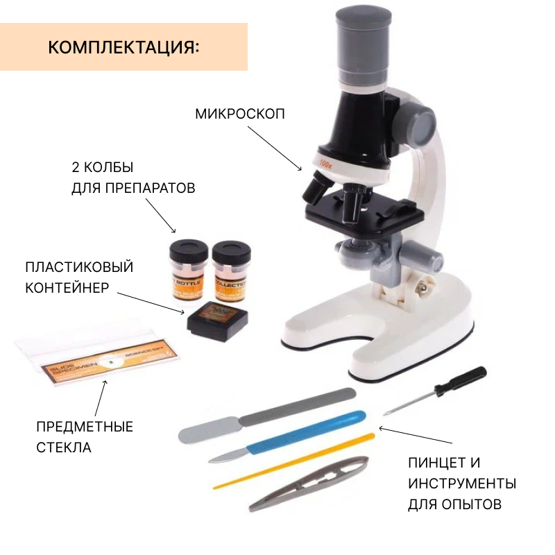 | Комплектация | - микроскоп - 2 колбы для препаратов - пластиковый контейнер - предметные стекла - пинцет - инструменты для опытов |