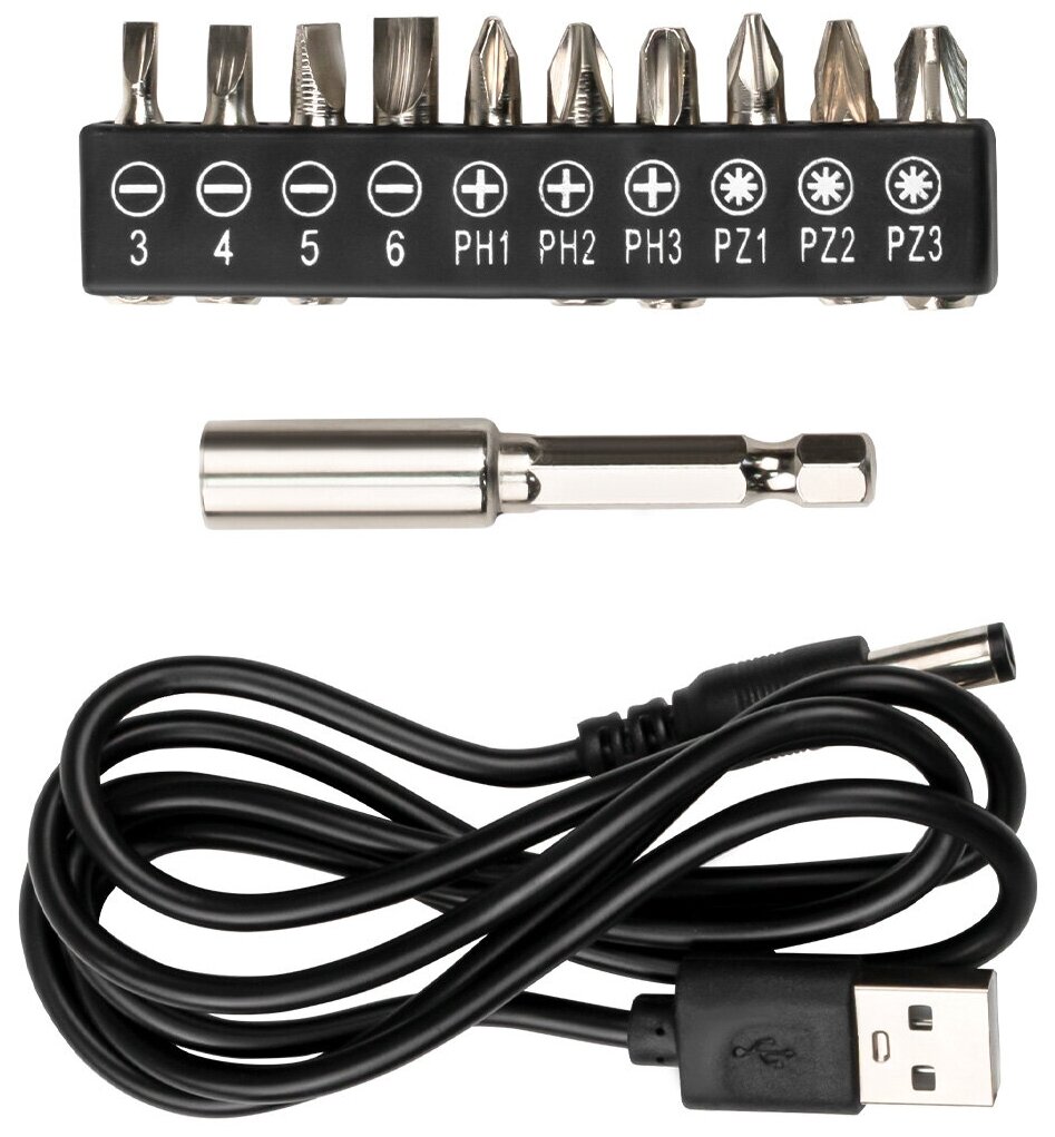 | Подробная комплектация | USB-кабель, биты 10 шт., переходник для бит |
