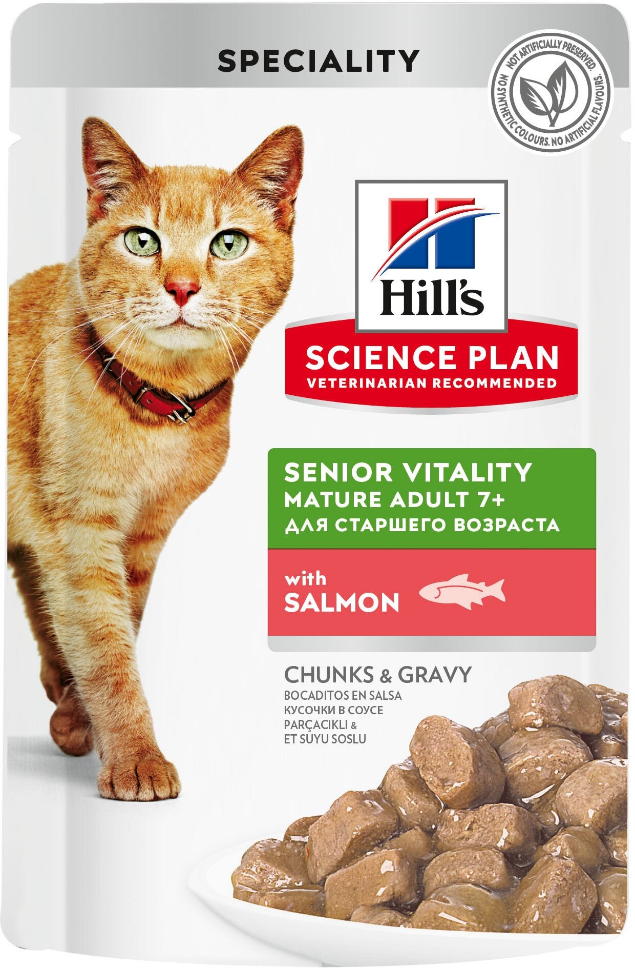 Влажный корм Hill's Science Plan Senior Vitality для пожилых кошек (7+)для поддержания активности и жизненной энергии, пауч с лососем, 12 шт х 85 г