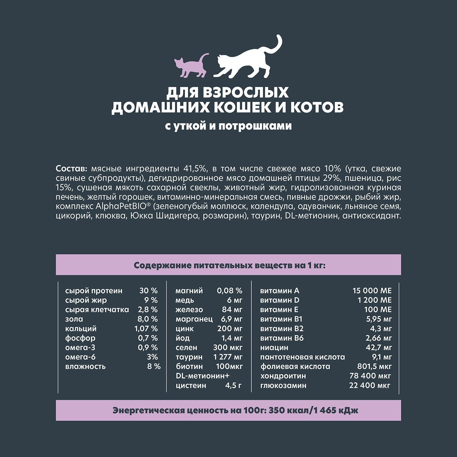 | Состав | Мясные ингредиенты 41,5%, в том числе свежее мясо 10% (утка, свежие свиные субпродукты), дегидрированное мясо домашней птицы 29%, пшеница, рис 15%, сушеная мякоть сахарной свеклы, животный жир, гидролизованная куриная печень, желтый горошек, витаминно-минеральная смесь, пивные дрожжи, рыбий жир, комплекс AlphaPetBIO® (зеленогубый моллюск, календула, одуванчик, льняное семя, цикорий, клюква, Юкка Шидигера, розмарин), таурин, DL-метионин, антиоксидант. |