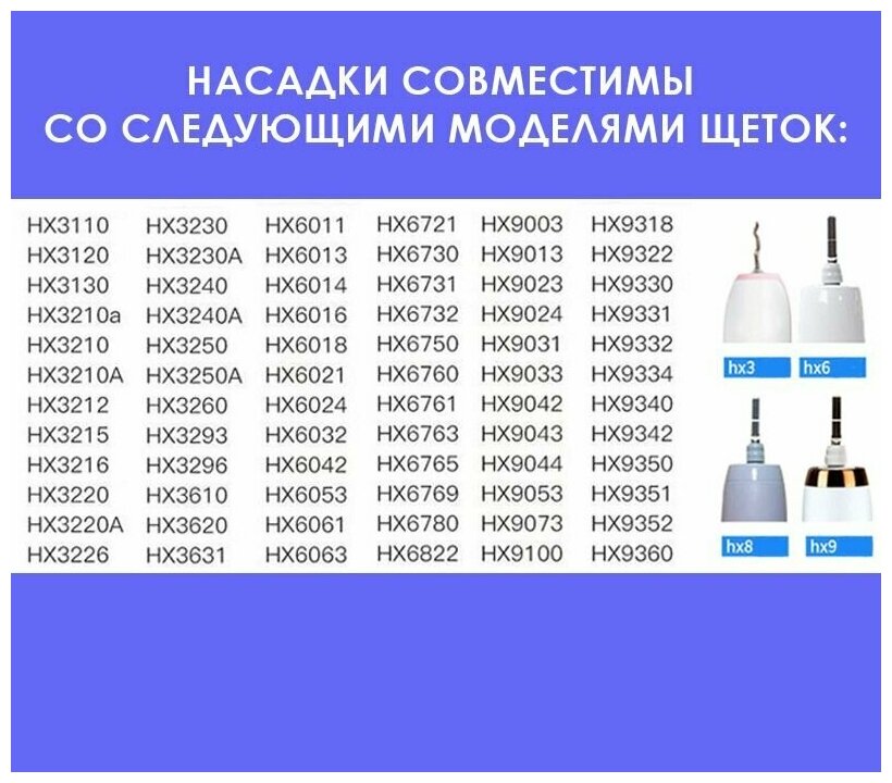 | Совместимость | Совместима с Philips 2 Series / Philips 3 Series / Philips CleanCare+ / Philips DiamondClean / Philips EasyClean / Philips FlexCare / Philips FlexCare+ / Philips For Kids / Philips HealthyWhite / Philips HealthyWhite+ / Philips PowerUp / Philips ProtectiveClean / Philips Sonicare HealthyWhite / Philips Sonicare / кроме моделей PowerUp Battery и Essence. |