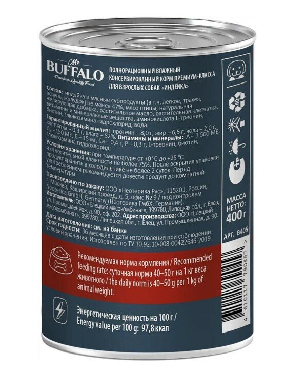 MR.BUFFALO ADULT 400 г консервы полноценный влажный корм для собак индейка 1 шт