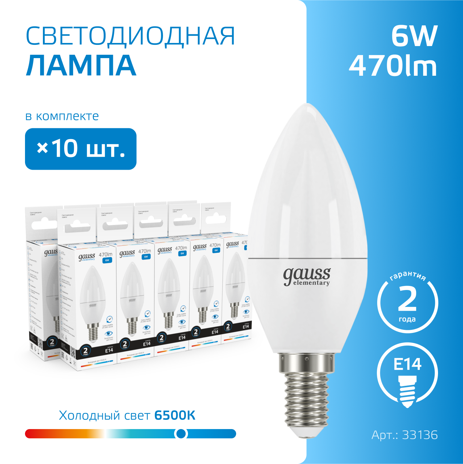 Лампочка светодиодная E14 Свеча 6W холодный белый свет 6500K упаковка 10 штук Gauss Elementary